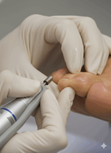 In unserer Praxis hat Ihre Sicherheit und Ihr Komfort oberste Priorität. Bei der podologischen Behandlung, insbesondere beim Schleifen von Nägeln oder dem Abtragen von Hornhaut, setzen wir daher ausschließlich auf die fortschrittliche Nasstechnik. Im Gegensatz zu älteren Trockenverfahren bietet diese Methode entscheidende Vorteile für eine sanfte und medizinisch einwandfreie Behandlung.